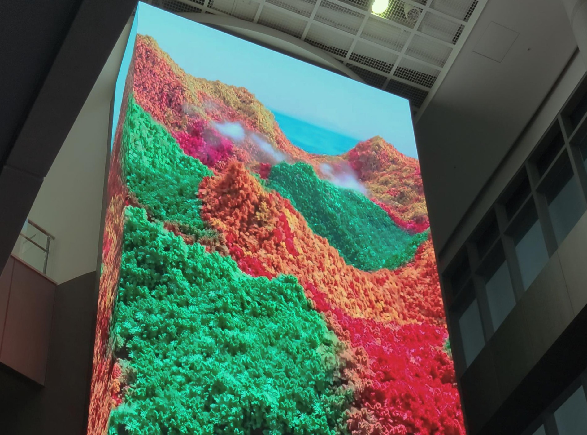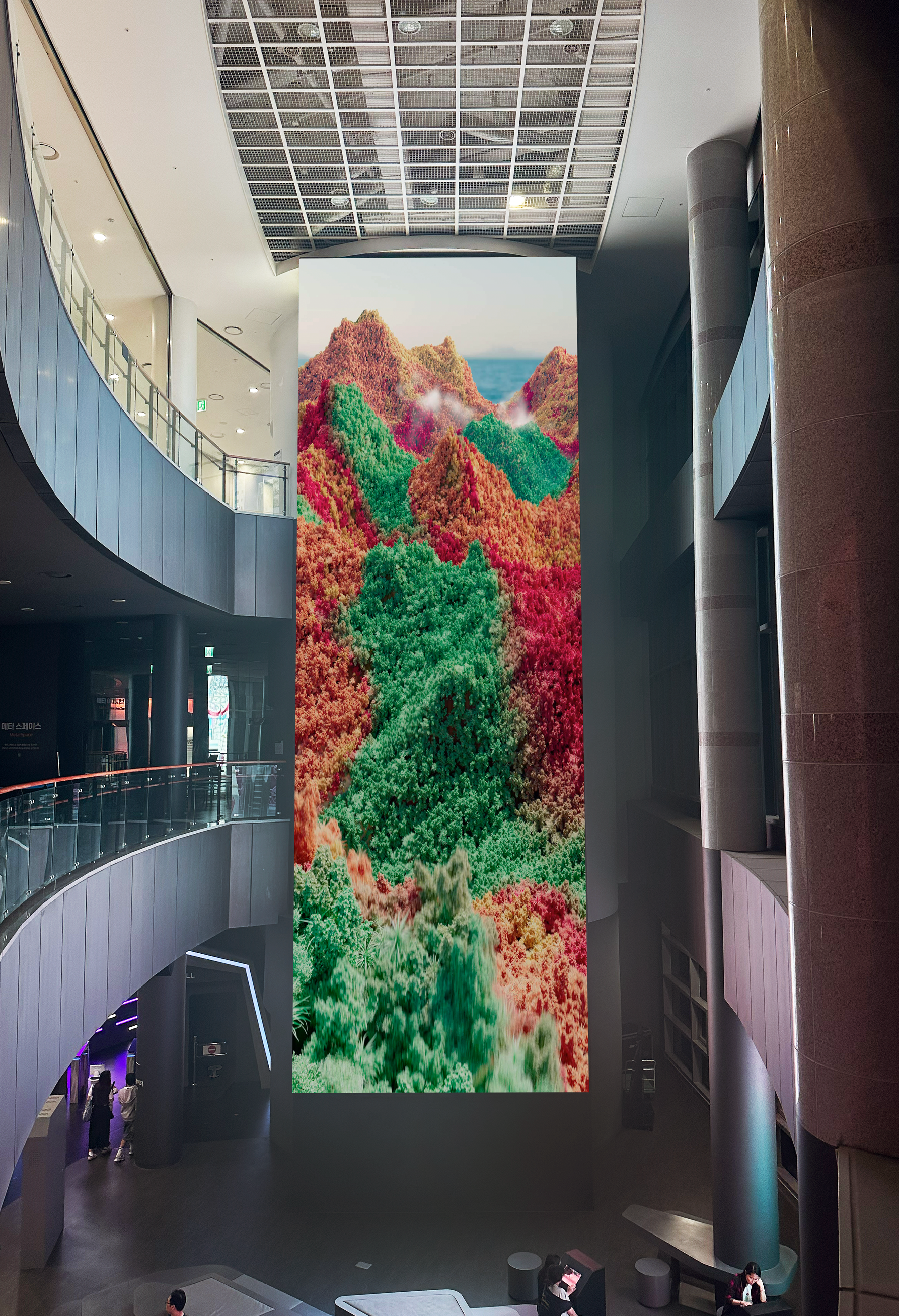 초거대 세로형 미디어아트 작품 〈오대산, 파도의 산맥〉은 강릉의 상징인 오대산의 자연과 바다의 파도를 교차적으로 재해석한 추상적 영상 작품입니다.