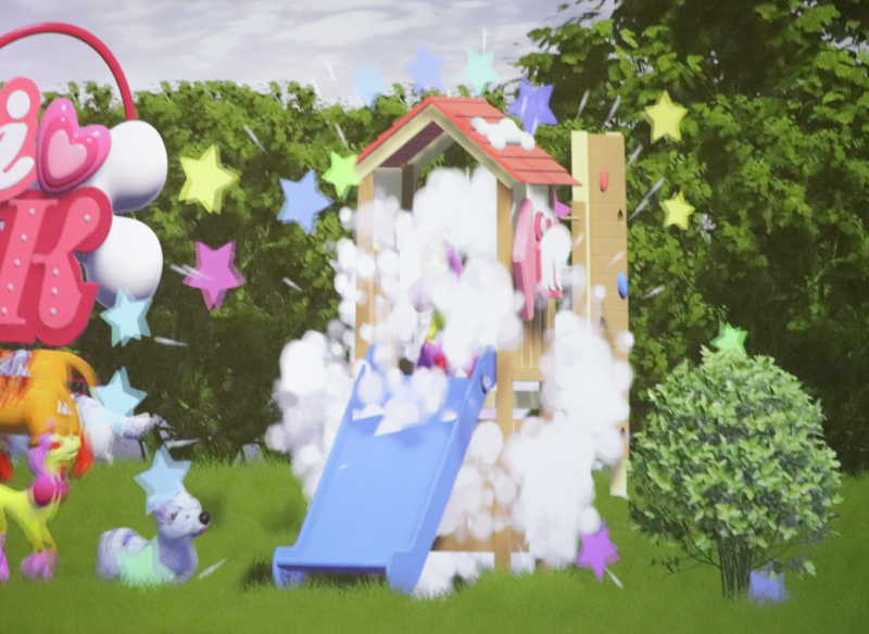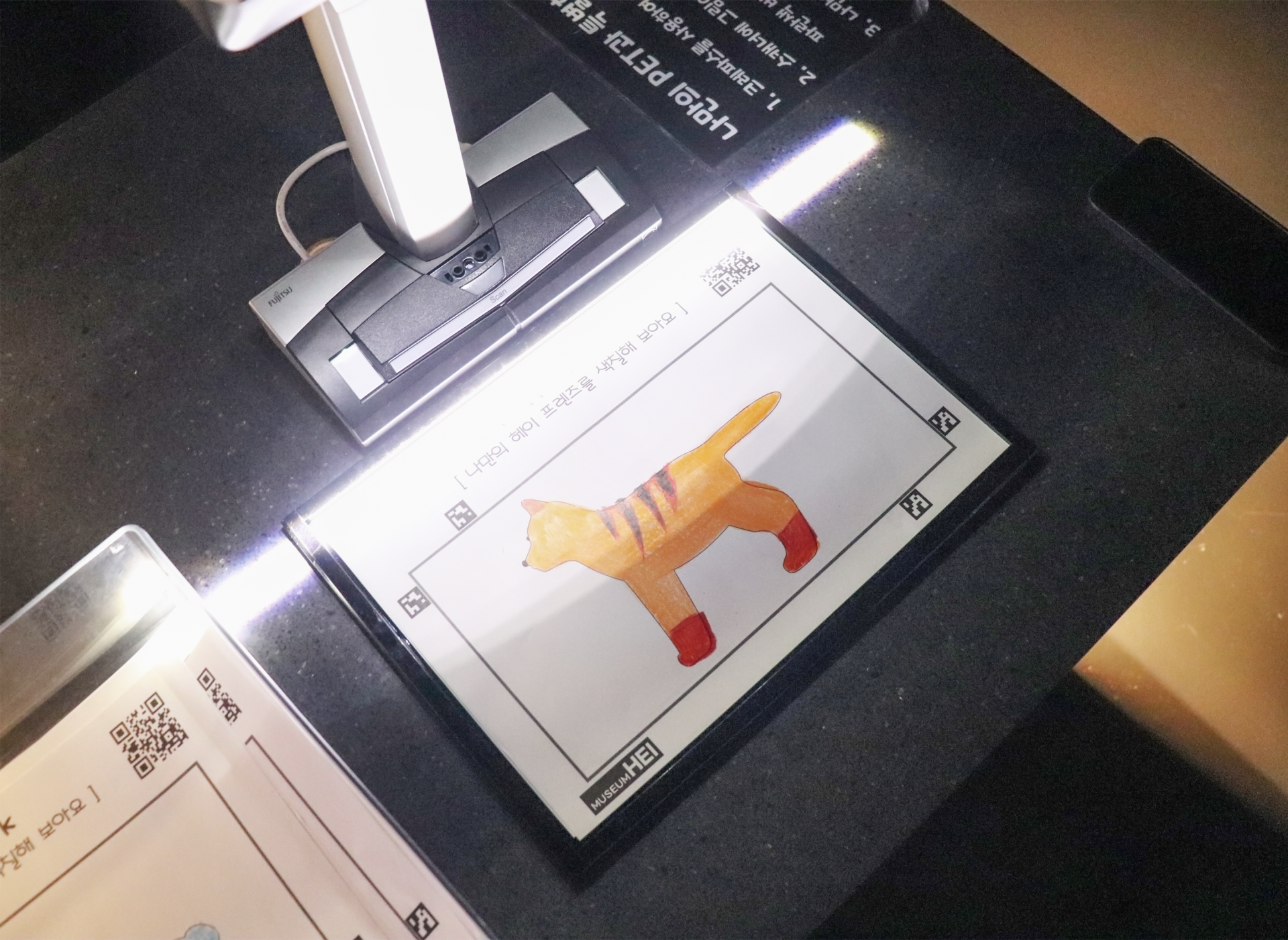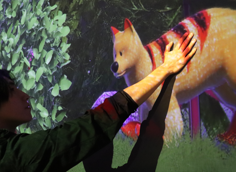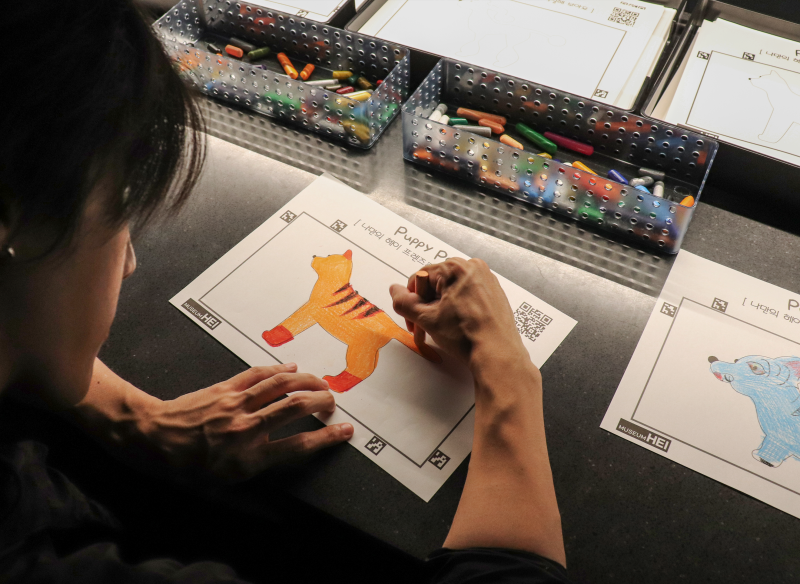 관객이 직접 색을 칠하거나 패턴을 그려 넣으면, 그 이미지가 스캔되어 대형 스크린 속으로 투영되고 자신이 만든 강아지가 생동감 있게 등장합니다.